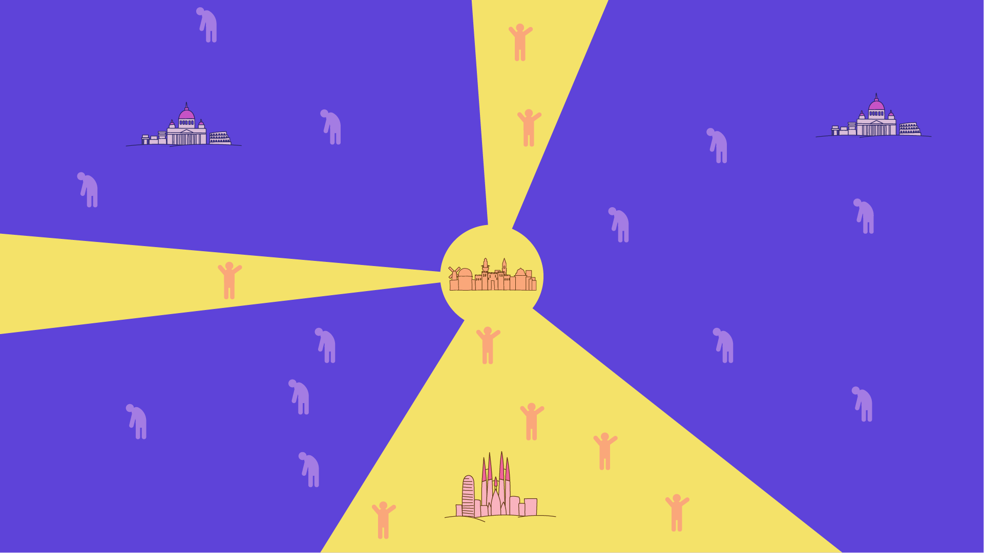 Click to create and expand beams of light radiating from Jerusalem. Each click expands existing beams or creates new ones. Expand strategically to cover more of the world.